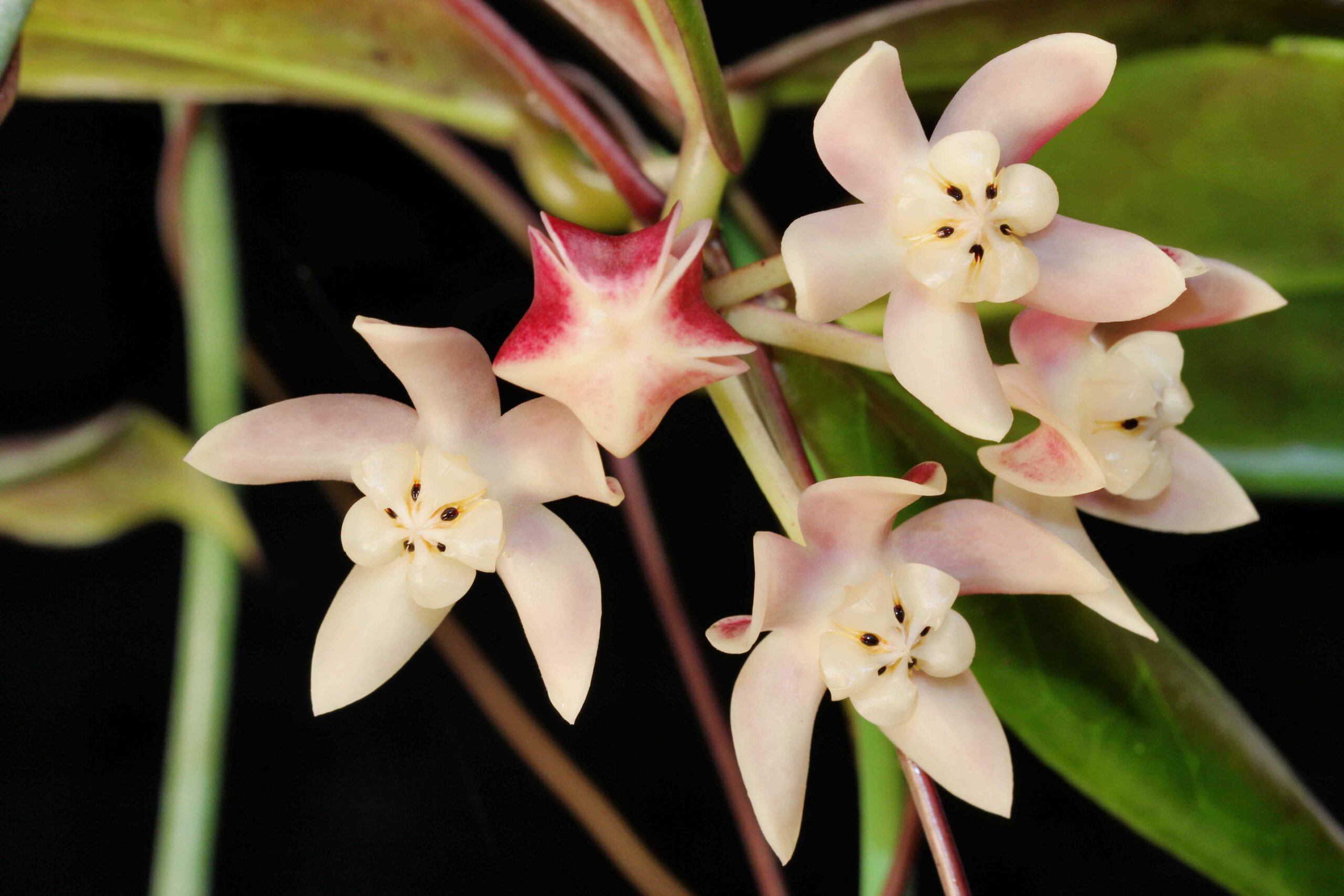 Цветы мелкие, звёздчатые, собранные в плотные зонтиковидные соцветия по 15–25 штук. Венчик окрашен в нежный кремово-персиковый оттенок, а коронка в центре — в насыщенный бордовый или тёмно-пурпурный, что создаёт драматичный контраст. Аромат цветков — лёгкий, сладковатый, с нотками ванили и цитрусовых, наиболее интенсивный в вечерние часы.